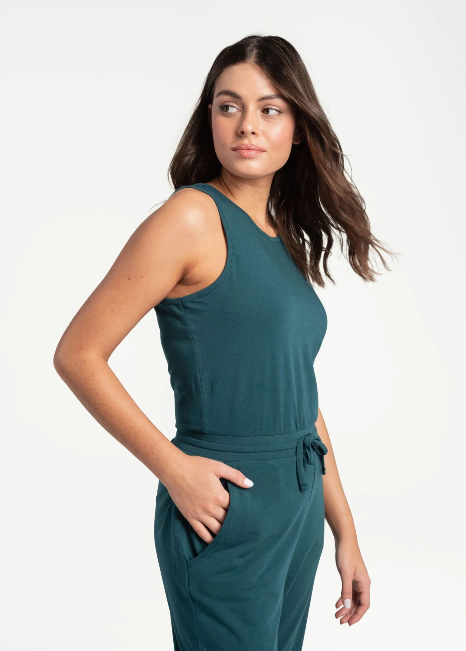 A jumpsuit to reach for again and again. Made from lightweight recycled jersey and finished with handy front pockets, slip into this sleeveless jumpsuit post-workout.